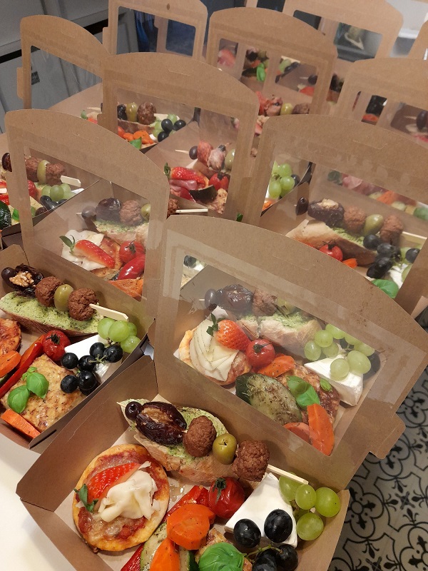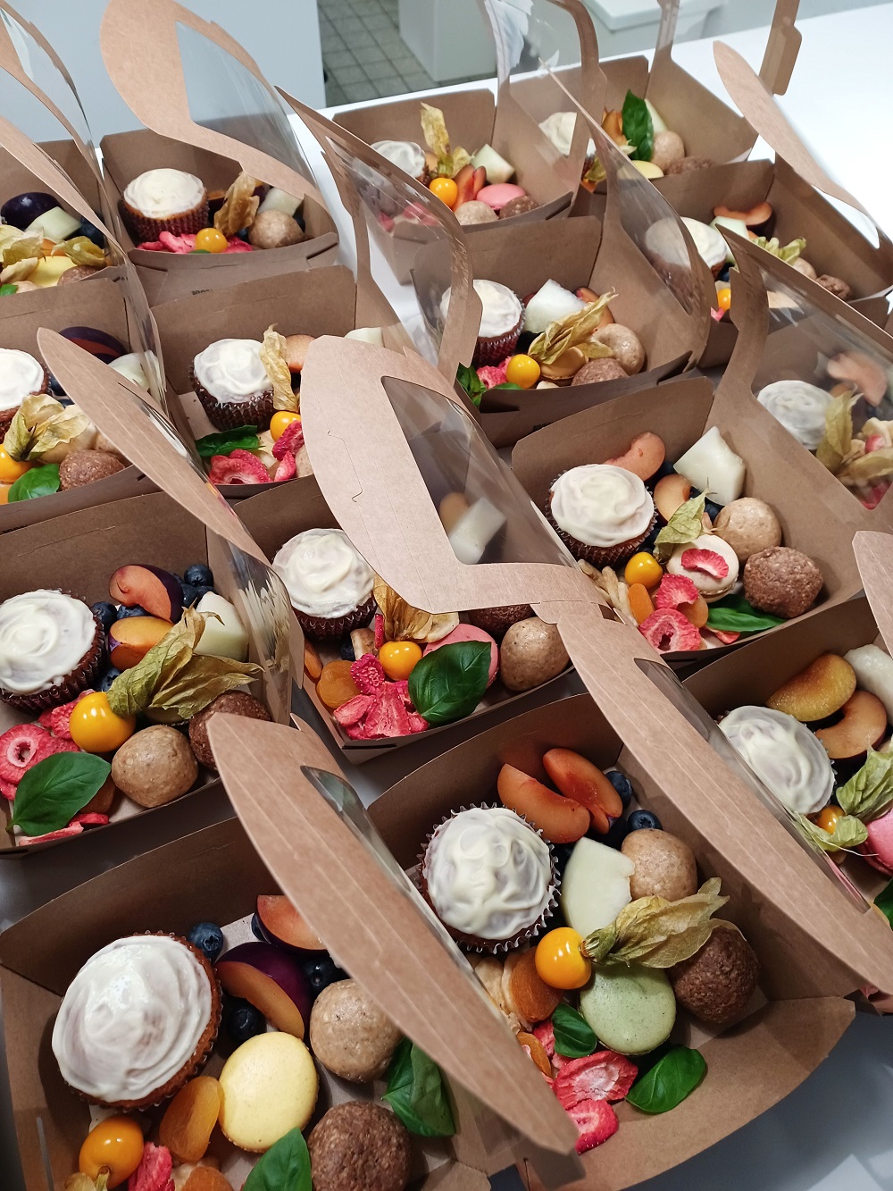 Abenteuerliche Zeiten bringen leckere Lösungen! Da wir derzeit als "die Festmanagerin" bei den Möglichkeiten der "rauschenden" Feste & Buffets etwas begrenzt sind, bieten wir Ihnen jetzt ein ganz eigenes kleines "Buffet" an - die Festbox! Für Sie selbst, zum Verschenken, für Meetings & für alle anderen erdenklichen Anlässe! Diese Häppchen Boxen mit Leckereien können ab einer Anzahl von 12 Einheiten vorbestellt werden. Bitte bedenken Sie: Da dies, wie all unsere Speisen- in liebevoller Handarbeit zubereitet wird, benötigen wir eine Vorlaufzeit von mindestens einer Woche.